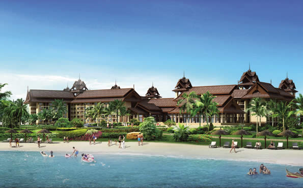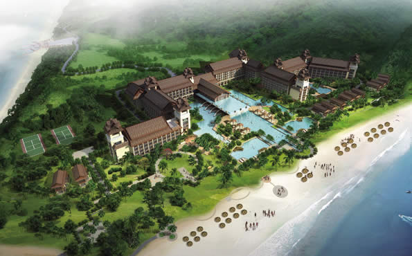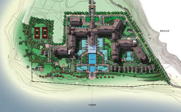 项目位于陵水猴岛下,三面临海,建筑设计结合周边地形创造独特的阶梯建筑风格,酒店以山体为背景勾画建筑轮廓线。将独特的酒店环境与建筑造型结合,形成极具当地文化特色的热带风情酒店。